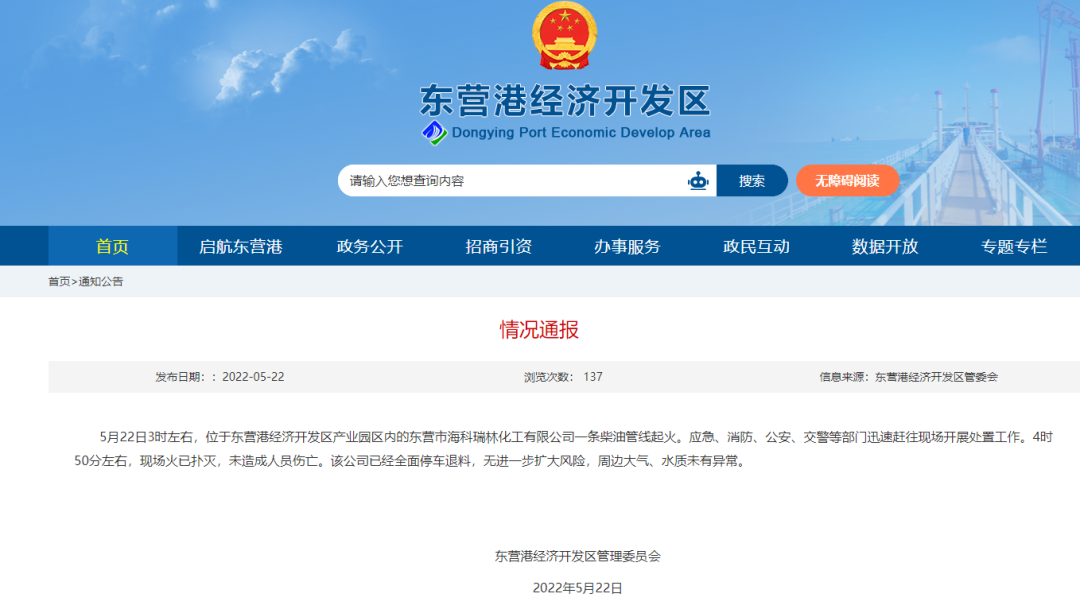 據(jù)東營(yíng)港經(jīng)濟(jì)開(kāi)發(fā)區(qū)官網(wǎng)披露,5月22日3時(shí)左右,位于東營(yíng)港經(jīng)濟(jì)開(kāi)發(fā)區(qū)產(chǎn)業(yè)園區(qū)內(nèi)的東營(yíng)市??迫鹆只び邢薰疽粭l柴油管線起火。應(yīng)急、消防、公安、交警等部門(mén)迅速趕往現(xiàn)場(chǎng)開(kāi)展處置工作。4時(shí)50分左右,現(xiàn)場(chǎng)火已撲滅,未造成人員傷亡。該公司已經(jīng)全面停車(chē)退料,無(wú)進(jìn)一步擴(kuò)大風(fēng)險(xiǎn),周邊大氣、水質(zhì)未有異常。